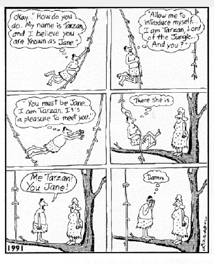 What about every day life and challenges? With little reflection most of us can remember and imagine numerous occasions of avoiding vulnerability: the missed tackle; the silence when we could have spoken up; the reluctance to go for something difficult, such as when we wanted to swing by, like Larson’s Tarzan, and greet beautiful Jane but didn’t, or we did and our rehearsed rhetoric turned out like rubble. (I presume there is a “we” in that last one).
